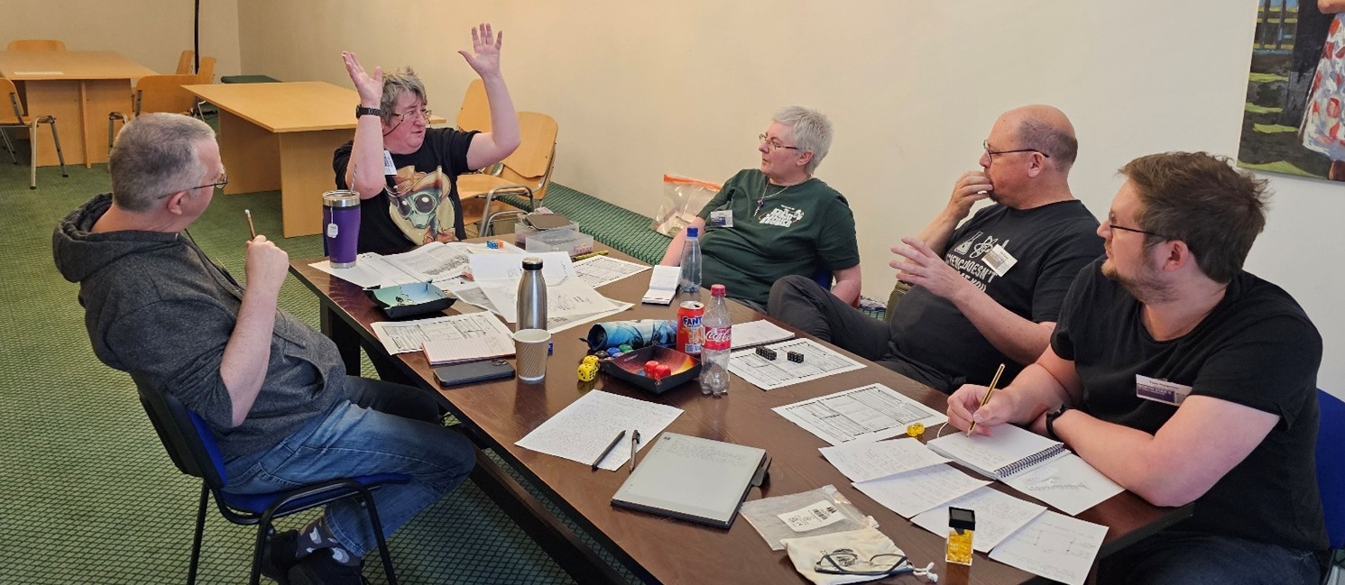 It was a good way of preparing for the 10am slot on Sunday which was where “Batch 24381” was fitting into the convention. I hadn’t twigged when offering a game that some slots were shorter than others and I’d rather limited myself by things I definitely wanted to play in! So now I was refereeing an adventure in just three hours, not the four I’m used to from TravCon and my previous outing at North Star. It was rather daunting to see that Graham S had signed up (no pressure, then!) as had Eugene C, Dr Moose, Steven P, Andy S, and Tom P. For those who don’t know the plot and without spoiling too much, an anagathics researcher has gone missing a troubleshooting team of academics are tasked with tracking her down. Various other factions are interested as well.