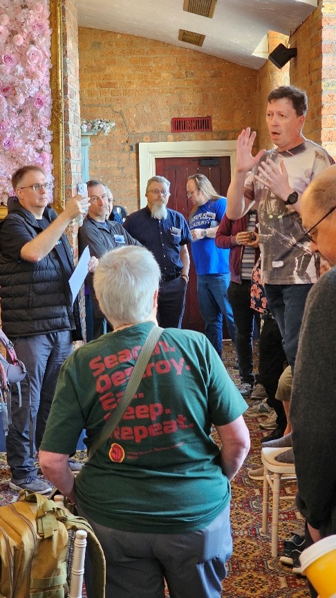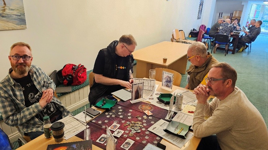 After a very light lunch and another stop to recover some energy, it was time for my final game. Well, not until the convention raffle and wrap up. Dom and Graham had some Patriot Games vouchers (a gaming shop in Sheffield) to give away and all our badges were entered into the draw. I managed to win a £20 voucher which was a nice birthday present as I turned 60 on the morrow. There was a bigger surprise however when Graham, in cahoots with Jane and the hotel staff, produced a lovely big chocolate cake for someone celebrating his 10.5 terms. It took me a moment, I’m that slow, to work out he meant me. Still, it was very kind of them. After which it only remained to announce that North Star would be happening again next year. Also, Furnace would be happening in October. That covers not just SF but all RPG types. They are planning on expanding slightly by using one of the function rooms, so Graham and Dom were keen for everyone present to think about offering at least one game if they were going to attend. It’s a pity it’s my busiest teaching time of the year at work or I might be persuaded to attend. Perhaps given the distance Sheffield is, it’s best that I don’t try to fit in another thing.